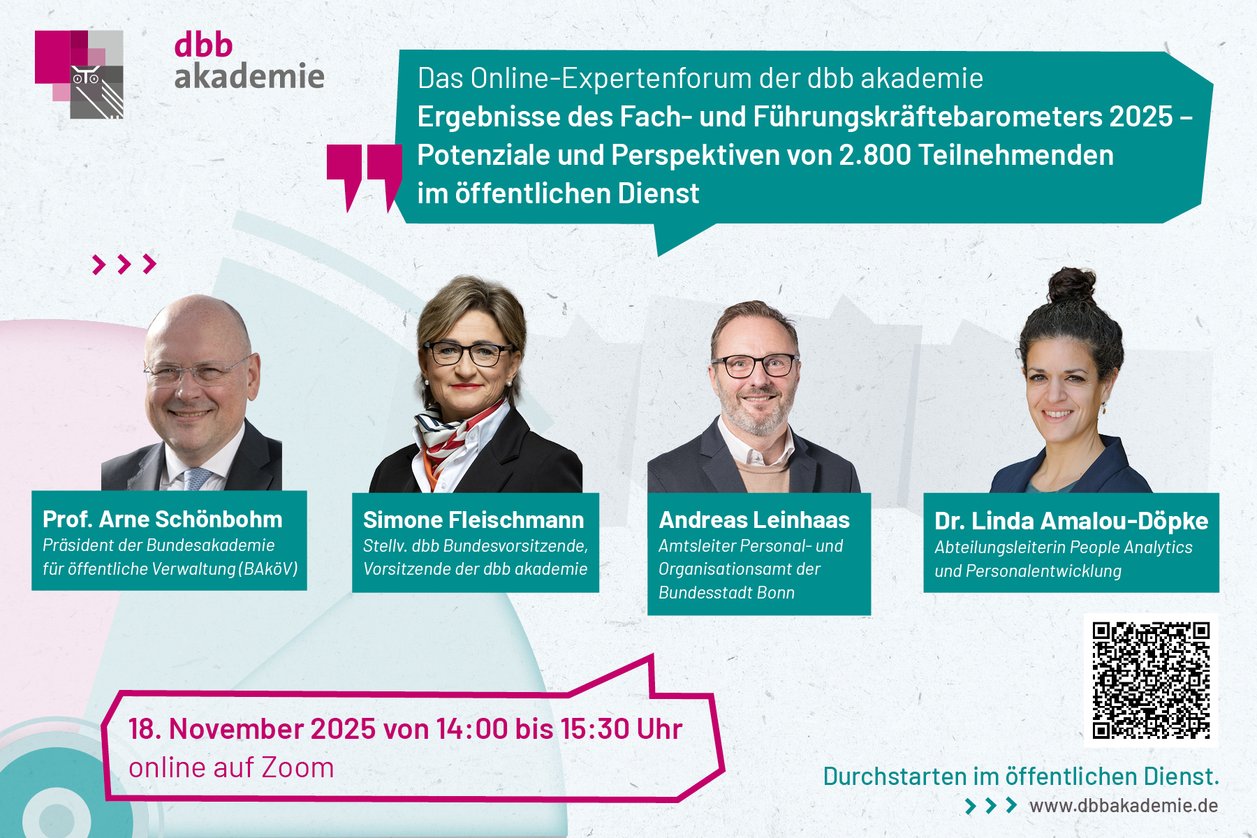 Die dbb akademie hat gefragt und 2.800 Fach- und Führungskräfte der öffentlichen Verwaltung haben geantwortet. Das Barometer zeigt eine hohe Veränderungsbereitschaft der Beschäftigten, doch es braucht mehr Anerkennung, moderne Strukturen und bessere Möglichkeiten zur Weiterbildung und Entwicklung.
