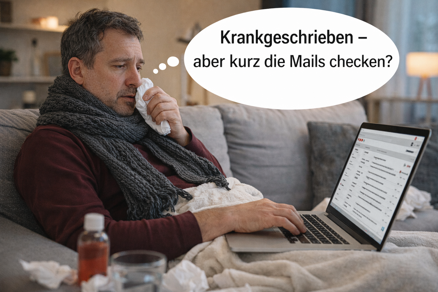 Eine Situation aus der Praxis: Der Arzt schreibt krank, aber ganz untätig möchten viele Beschäftigte doch nicht bleiben. Also wird zu Hause doch kurz der Laptop geöffnet: ein paar E-Mails lesen, vielleicht eine Antwort schreiben oder eine dringende Rückfrage klären.
