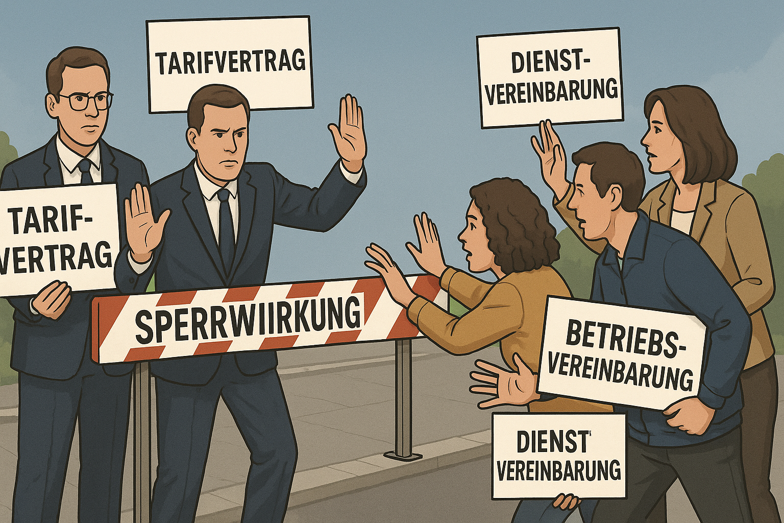 Die Sperrwirkung tritt übrigens unabhängig davon ein, ob der Tarifvertrag in der fraglichen Dienststelle bzw. dem Betrieb überhaupt Anwendung findet (Arbeitgeber und Arbeitnehmer also tarifgebunden sind). Es reicht aus, wenn die Tarifvertragsparteien für diesen Bereich Regelungsmacht beansprucht und Vereinbarungen getroffen haben.